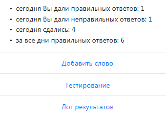 Если хотите посмотреть на свои успехи изучения за сегодняшний день, жмите на ссылку результаты сего днярезультаты сего дня